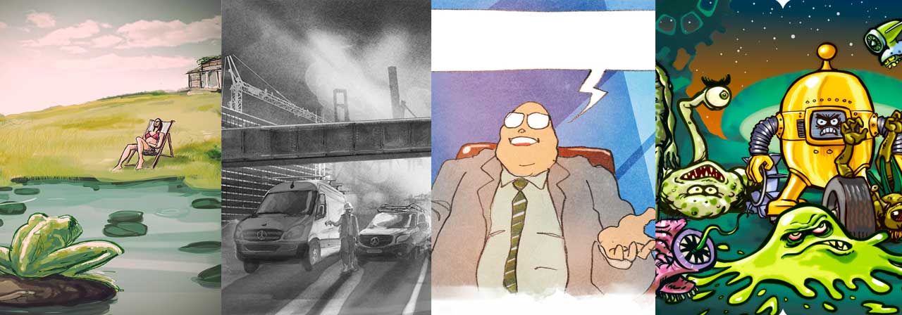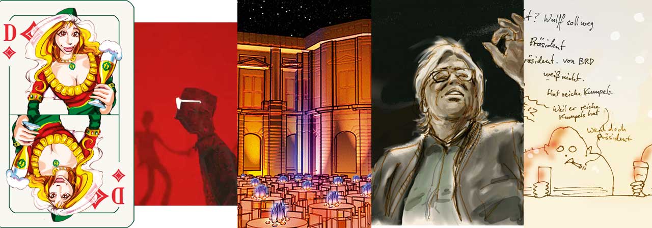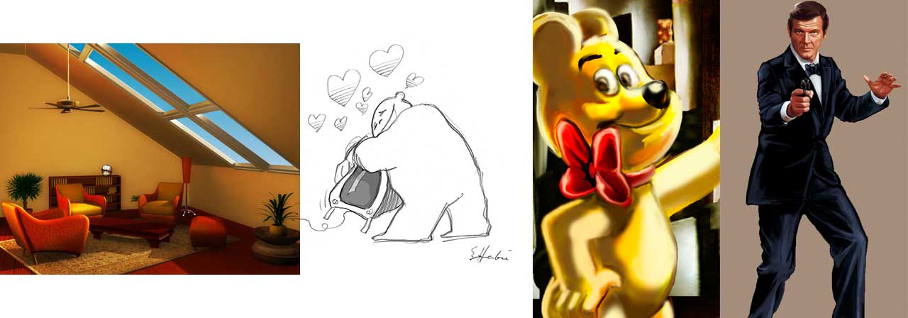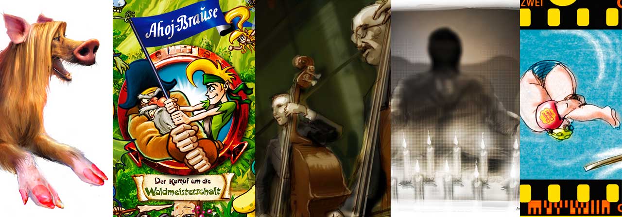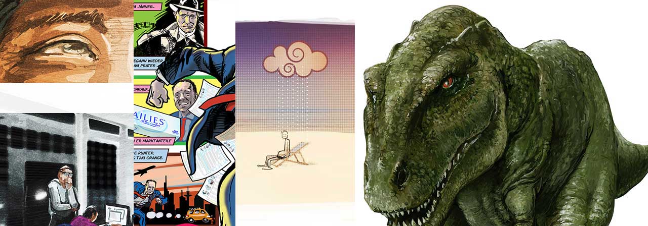 Illustrationen und Zeichnungen. Mit Stift und Tusche. Mit Wacom-Tablett. Karikaturen, Scribbles, Photoretuschen. Mit Photoshop. Und Illustrator. Und Flash, ArtRage, Rebelle… 3D-Arbeiten mit Modo, Cinema 4D, ElectricImage. Comics, Buch- und Zeitschriftencover, Editorials, Photolayouts, Produktfakes, Storyboards… nein, die kommen weiter unten. etc. --> (coming soon)